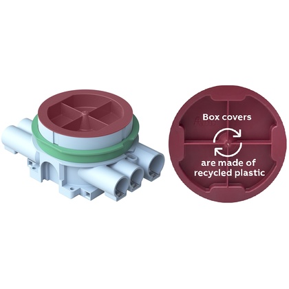 Dosan är försedd med roterande monteringsring med skruvavståndet cc 67mm. Den medföljande gröna distansringen används vid enkelgips (13mm). Ringen avlägsnas när dosan monteras i dubbelgips (26mm). Dosan är försedd med fem fasta stutsar för 16mm rör av vilka ett är öppnat samt två fasta stutsar för 20mm rör. Dessutom finns två utbrytningar på sidorna och två i botten av dosan. Lösa stutsar E1422342 - 44, bottenstutsar E1422347 - 49. Dosorna kan sammanbyggas med sammankopplingsstycke E14 223 15 - 17. Dosan är brandklassad IE30/IE60 vid montage enligt speciell montage guide. Tillverkad av halogenfritt material (IEC/61249-2-21) och uppfyller glödtrådsprovets krav enligt standard IEC/EN60670:2005 (850°C). Dosans putslock och gröna distansring är tillverkat av återvunnen plast.