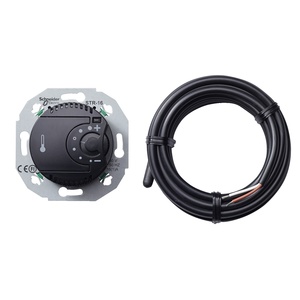 Renova Elektronisk golvtermostat 2-pol. 16A Lysdiod som indikerar grönt=drift, rött=aktiv, +5 till 50°C, 1°C känslighet inkl fyra meter givare. För infälld montering i apparatdosa c/c 60mm. För utvändigt montage används dosa 35mm, snabbanslutning, kompletteras med valfri Renova ram. Svart