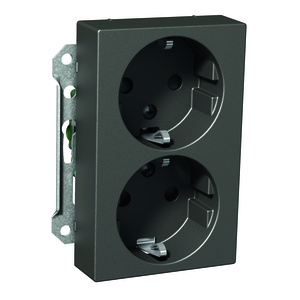 Exxact 2-vägsuttag, insats, jordat, snabbanslutning, petskyddat för infälld montering i apparatdosa c/c 60mm. Med två neutrala överkopplingsklämmor. Kompletteras med valfri Exxact-ram. Antracit