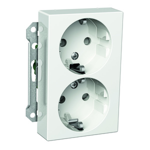 Exxact 2-vägsuttag, insats, separat brunntänning, jordat, snabbanslutning, petskyddat för infälld montering i apparatdosa c/c 60mm. Med två neutrala överkopplingsklämmor. Kompletteras med valfri Exxact-ram. Vit
