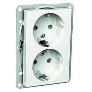 Exxact 2-vägsuttag, låg insats. Bygghöjd ut från vägg endast 12mm. Jordat, snabbanslutning, petskyddat för infällt montage i 1,5-modul apparatdosa. Med två neutrala överkopplingsklämmor. Kompletteras med valfri Exxact-ram. Vit