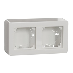 Dosa 2-fack för utanpåliggande montering. Separat botten- och lockdel för att förenkla installationen. Ramen är integrerad i kåpan så att ingen separat Exxact-ram behövs. 47mm hög. Nyckelhål för montage över apparatdosa c/c 60mm. Passar alla Exxact 1-facksprodukter. Ingångar för kablar från baksidan genom utbrytningar i bottenplattan eller från alla sidor med hjälp av utklipp i locket. Produkten är IP20. IP21 då kabeln förs in underifrån. Möjlighet att montera dragavlastning och skiljevägg.