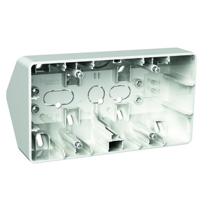 Exxact Hörnbox 2-fack för utanpåliggande montage i hörn- eller underskåp. För montage av två valfria produkter ur Exxact-sortimentet. Anslutning bakifrån eller från kortsidorna. Kompletteras med en valfri Exxact-ram 2-fack. Vit