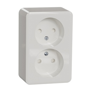 Vägguttag 2-vägs för utanpåliggande installation med integrerad bottenplatta. 16AX, 250V, ojordat, med 2st neutrala överkopplingsklämmor, petskyddat. Skruvanslutning. Ingångar för kablar från baksidan genom utbrytningar i bottenplattan eller från alla sidor med hjälp av utklipp i locket. Produkten är IP20 (även med kåpan borttagen). IP21 då kabeln förs in underifrån.