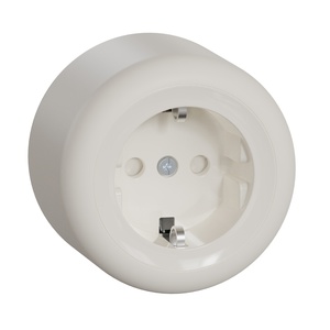Vägguttag 1-vägs för utanpåliggande installation med integrerad bottenplatta. 16AX, 250V, jordat, petskyddat. Snabbanslutning. Ingångar för kablar från baksidan genom utbrytningar i bottenplattan eller från alla sidor med hjälp av utklipp i locket. Produkten är IP20 (även med kåpan borttagen). IP21 då kabeln förs in underifrån.