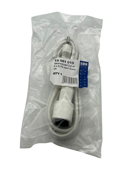 Skarvsladd för inomhusbruk. Plastkabel typ H03VVH-F 2G0,75. Med flat Eurostickpropp och flat Euroskarvuttag. Längd 2m. Vit