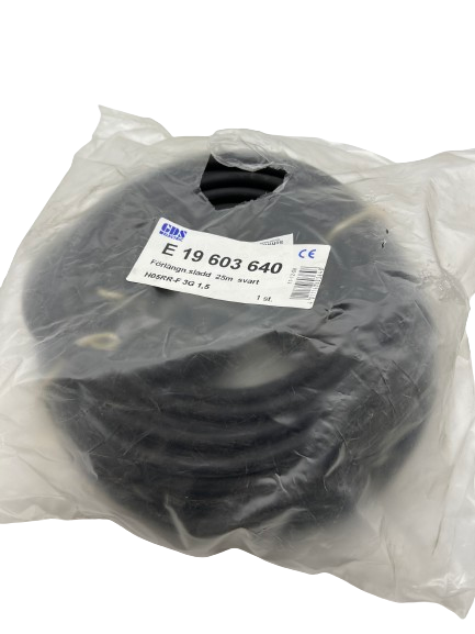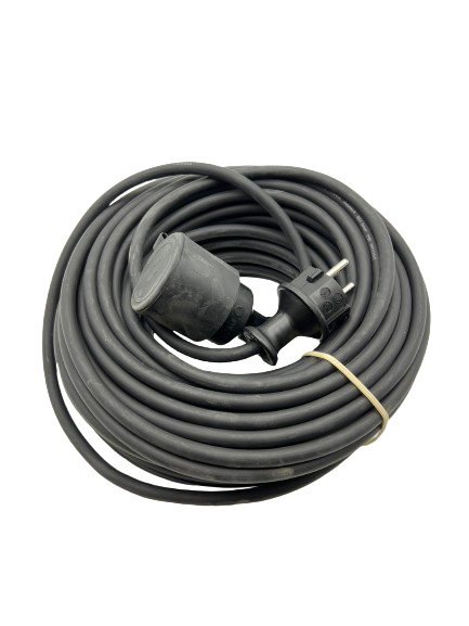 Skarvsladd för utomhusbruk. Gummikabel typ H05RR-F 3G1,5. Med jordad schukostickpropp och schukoskarvuttag. Längd 25m. Svart